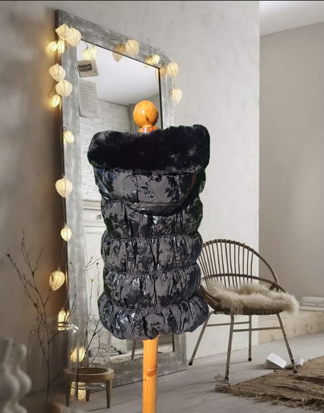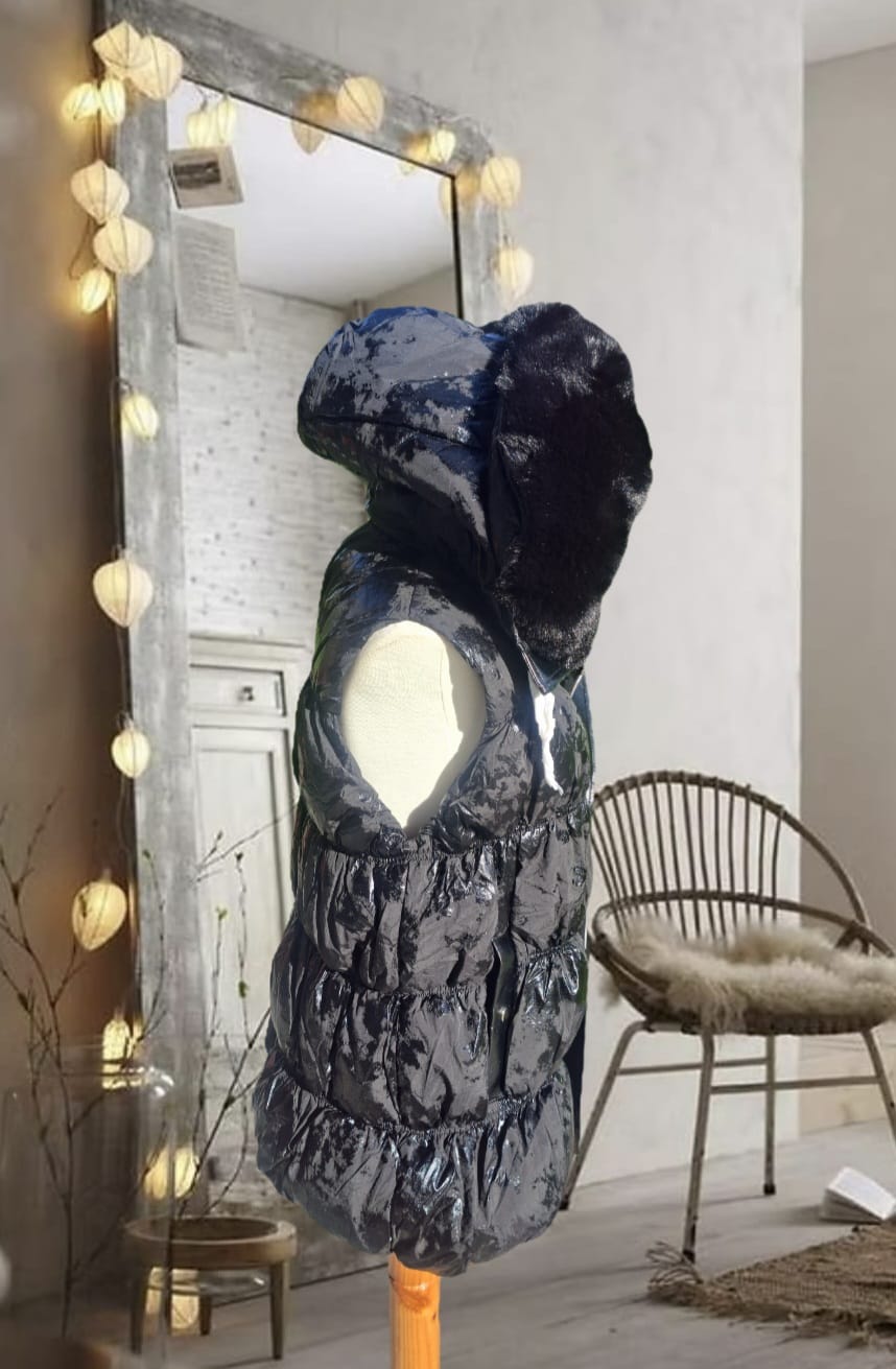 Chaleco de plumas con brillo, capucha, cuello de pelo y cierre de botones.