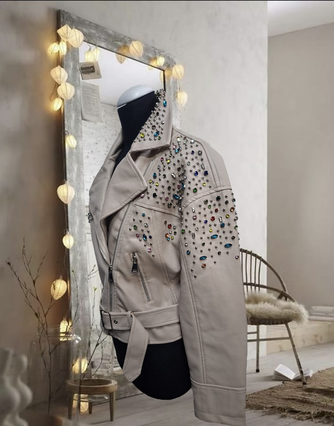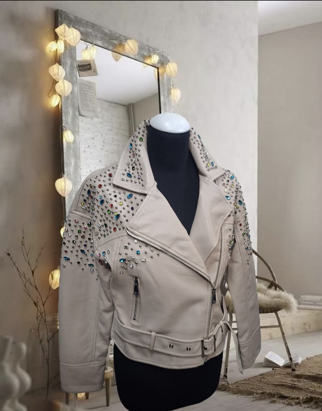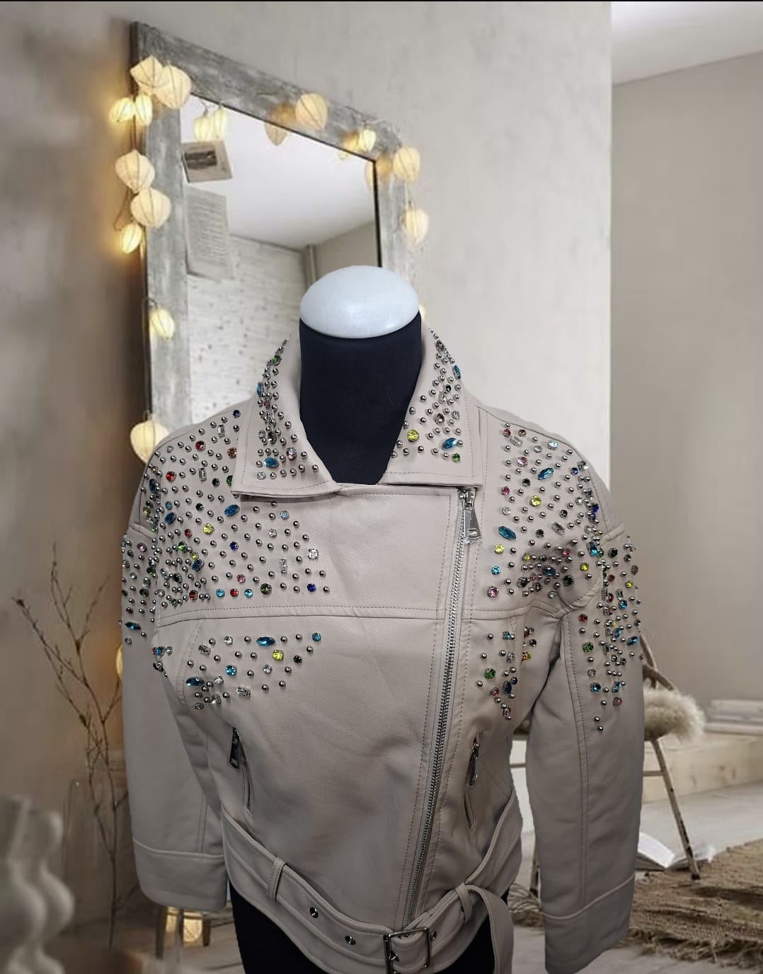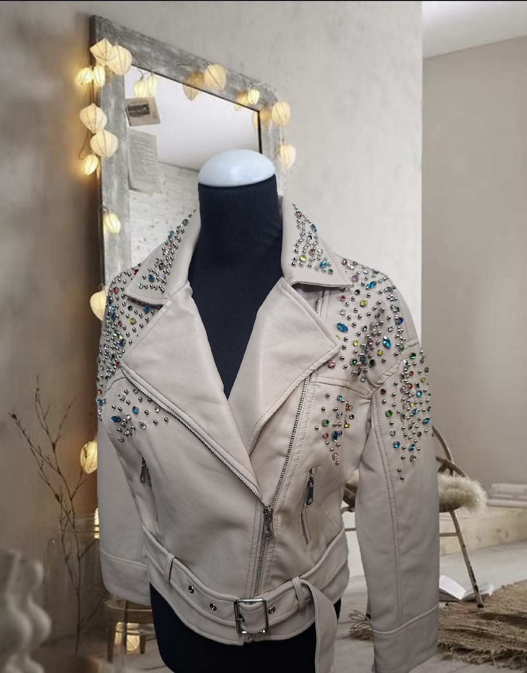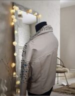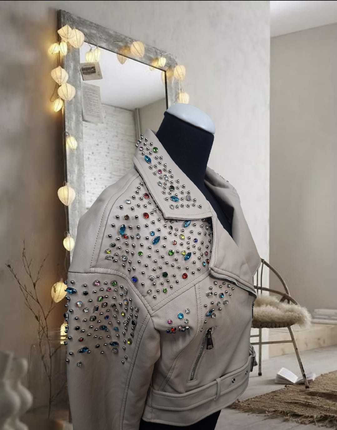 Chaqueta de cuero blanca con pedrería de colores y perlas