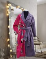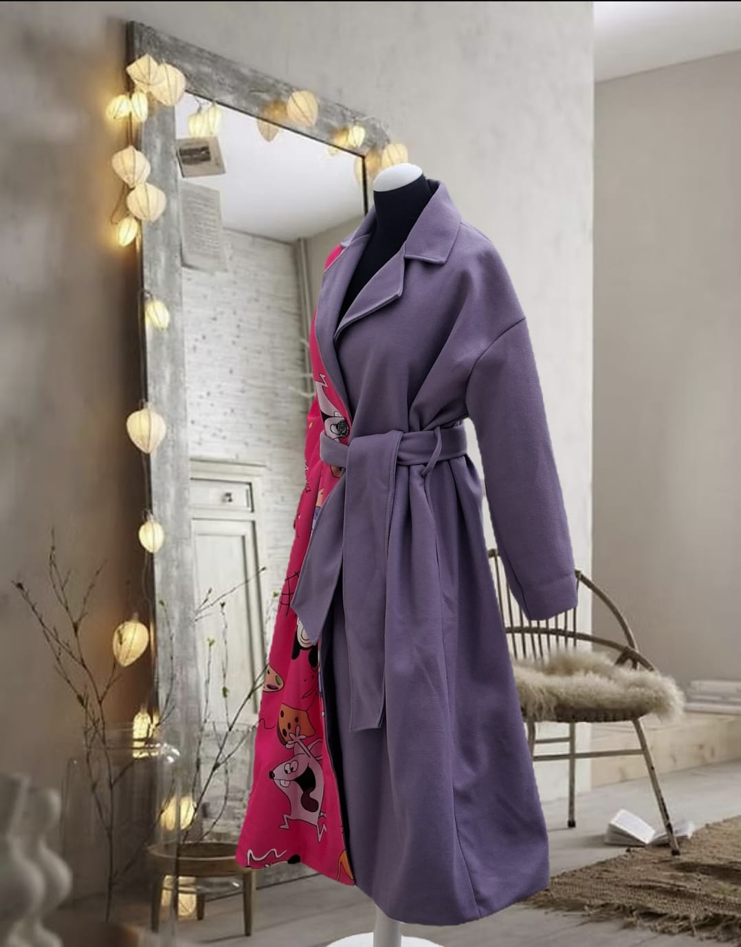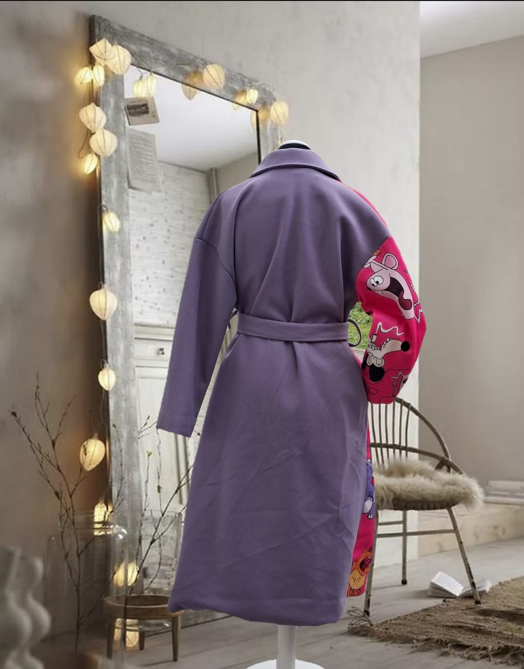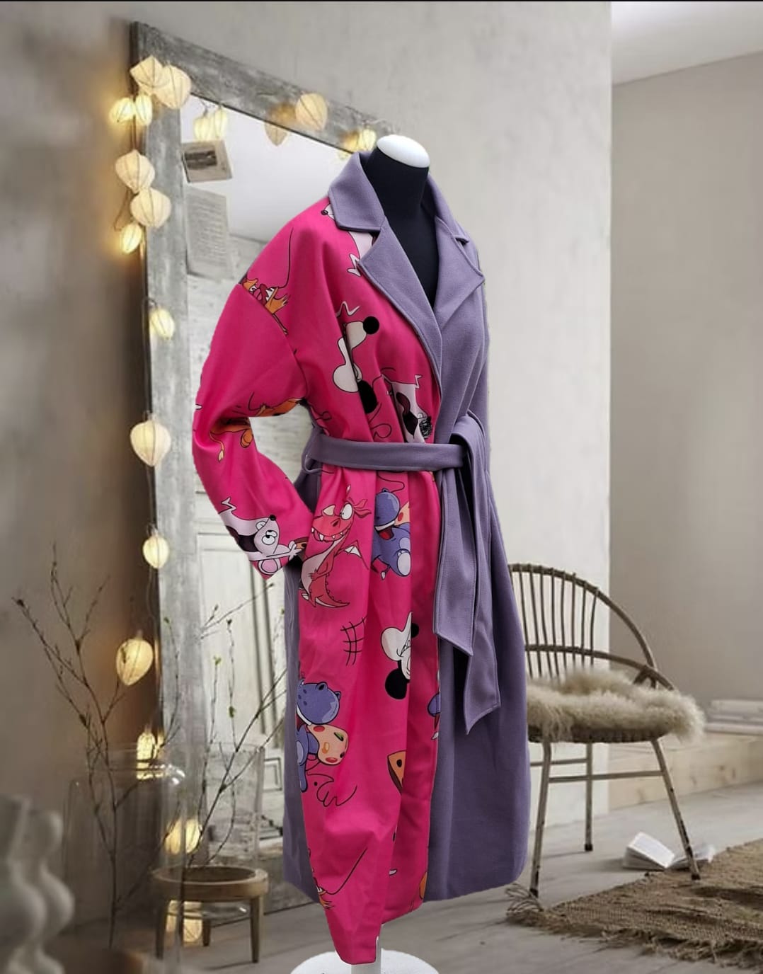 Gabardina de fieltro morada y fucsia con personajes de dibujos animados retro